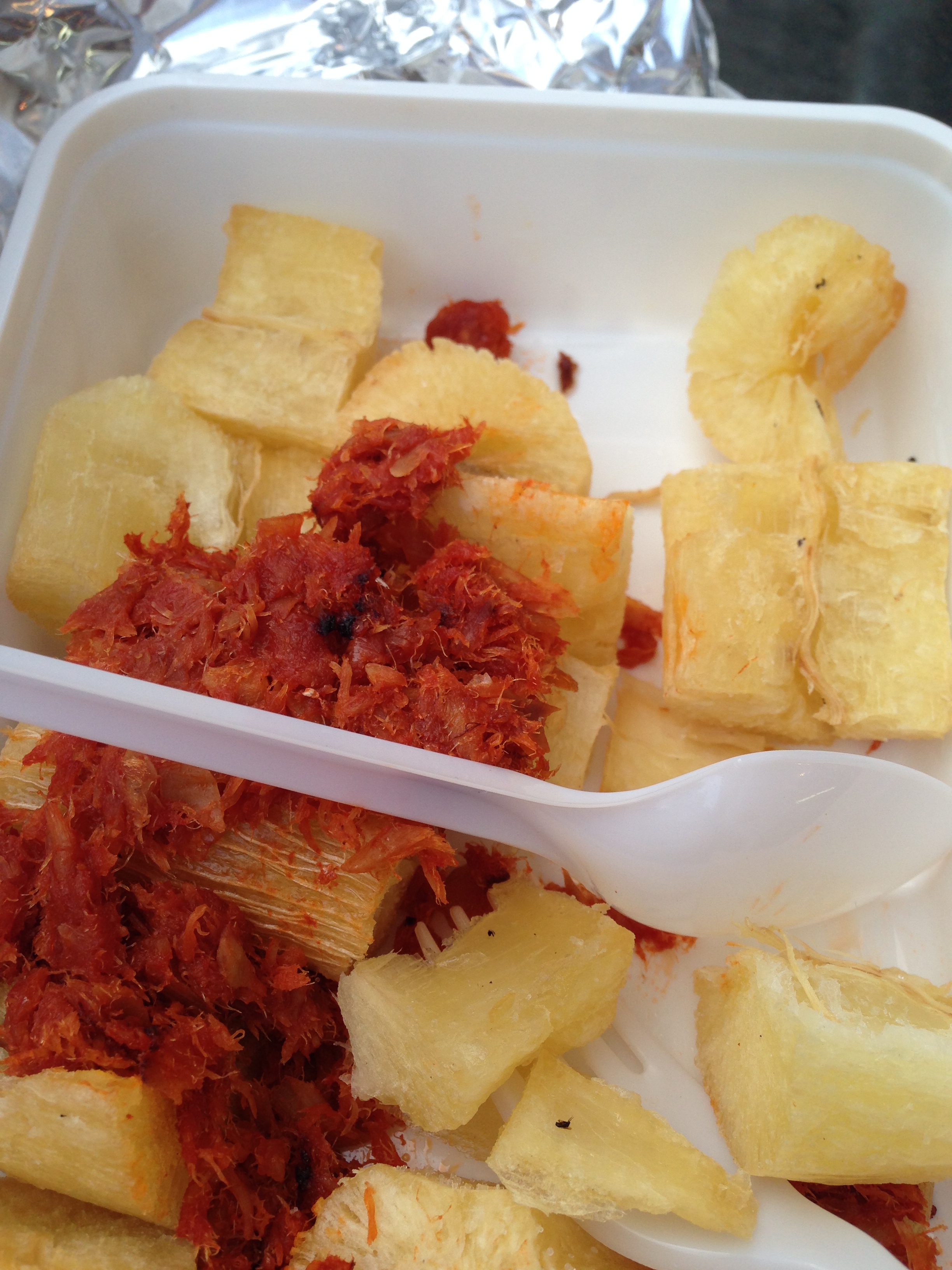 The bacalao was very fishy and a bit salty, and quite savory. It had the perfect firmness and a texture that reminded me a bit of brisket (but a little stringier). The cassava was sweet and salty (think 60% french fries, 30% banana, 10% doughnut). The texture had the softness of a baked potato but the stringy structure of celery.